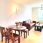 Благодарение на балкона и дневната зона, обзаведени с телевизор с плосък екран с сателитни канали, както и удобства като ютия с дъска за гладене и климатик, се гарантира максимален комфорт. Имотът е обзаведен и с комплект дивани. Апартаментът разполага с 2 спални. В банята има отделен тоалет и душ. Освен това, има и сешоар и хавлии.